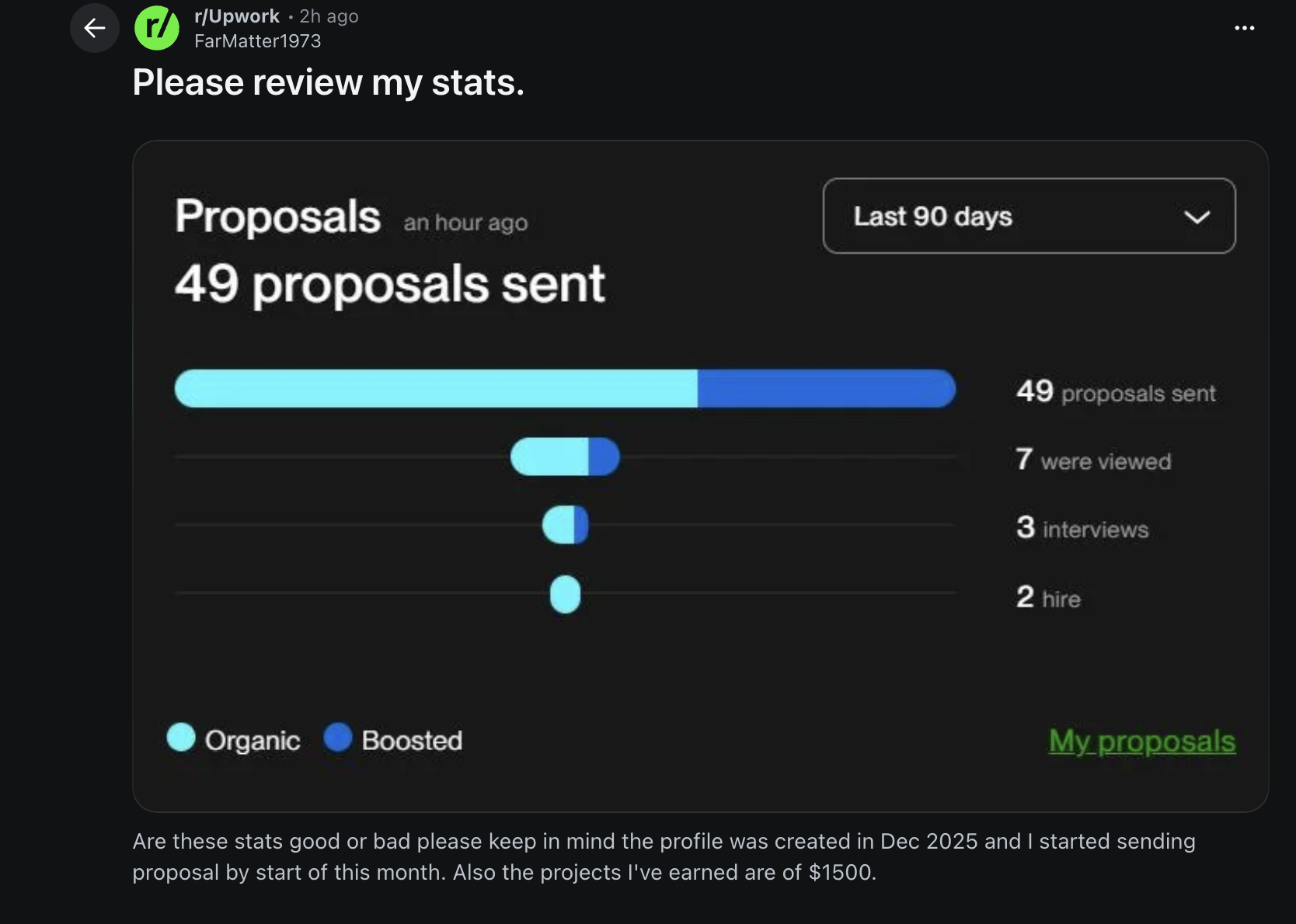Look at this from r/Upwork. 49 proposals sent in 90 days. Only 7 were even viewed. 3 interviews. 2 hires. $1,500 earned in the first few months on the platform. This is what the grind looks like. Most of your proposals will disappear into the void. The game is making sure the ones that land are good enough to convert.